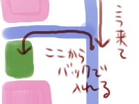 頭を前にして駐車するように、前の道に入るところからバックで駐車スペースに入れます。