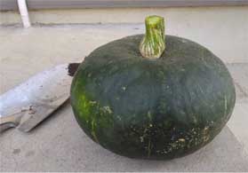 現在、畑がカボチャ蔓の海のようになっておりますが、ついに初収穫。